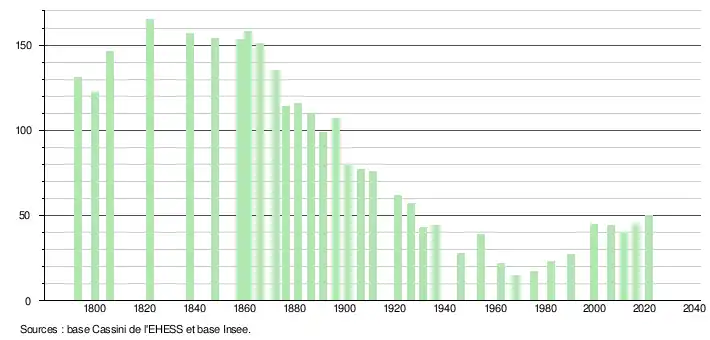 L'évolution du nombre d'habitants est connue à travers les recensements de la population effectués dans la commune depuis 1793. Pour les communes de moins de 10 000 habitants, une enquête de recensement portant sur toute la population est réalisée tous les cinq ans, les populations légales des années intermédiaires étant quant à elles estimées par interpolation ou extrapolation[30]. Pour la commune, le premier recensement exhaustif entrant dans le cadre du nouveau dispositif a été réalisé en 2006[31].