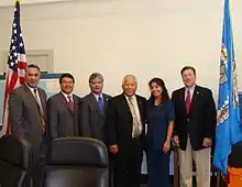 Photo représentant certains des lieutenant-gouverneur des Îles Mariannes du Nord. De gauche à droite : Nikolao Pula, directeur des affaires insulaires; Diego T. Benavente, représentant de la CNMI, président de la Commission des relations extérieures et des États-Unis; Arnold I. Palacios, président de la CNMI; Pete P. Reyes, président du Sénat; Glenna P. Reyes, directrice adjointe, Bureau législatif; Doug Domenech, secrétaire adjoint intérimaire aux affaires insulaires [Photo : Randy Beffrey, BAI