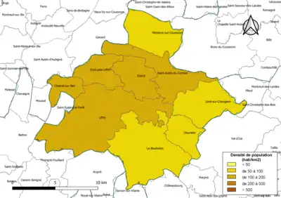 - Les densités de population sont calculées automatiquement dans un SIG en utilisant la surface géométrique de la commune, avec un niveau de précision du contour de 5 m tel qu'il ressort de l'export du découpage administratif au niveau communal (contours des communes) issu d'OpenStreetMap, et non la superficie cadastrale définie par l'Insee, qui est une donnée purement administrative. Des différences de classe peuvent ainsi éventuellement apparaître pour les communes qui se situent en limite de franchissement de seuil de classe.