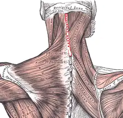 Son bord antérieur s'insère sur les processus épineux des vertèbres cervicales.