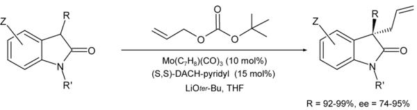 De plus, certaines AAA catalysées par le molybdène peuvent être plus régio-, énantio- ou diastéréosélectives que celles catalysées par le palladium[10]. Le ligand de Trost DACH-pyridyl est prépondérant pour ce genre de réaction[19] :