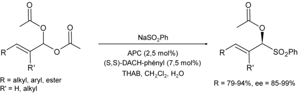 - Les ligands de Trost peuvent également catalyser la formation de liaison C-S de sulfones chirales[18] :