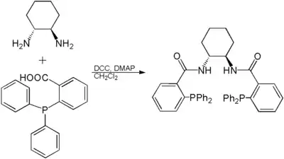 Le ligand de Trost est synthétisé via l'amidation des énantiomères (R,R) ou (S,S) du 1,2-diaminocyclohexane (DACH) avec l'acide 2-diphénylphosphinobenzoïque. La réaction, analogue à une estérification de Steglich, a lieu dans le dichlorométhane (CH2Cl2) en présence de dicyclohexylcarbodiimide (DCC) et de 4-diméthylaminopyridine (DMAP).