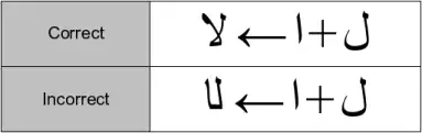 L’exemple le plus probant de ce type de ligature se rencontre dans l’alphabet arabe. Outre ses nombreuses variantes contextuelles, il connaît en effet une ligature linguistique, donc obligatoire, qui ne conduit pas à la création d’une nouvelle lettre. Il s’agit de la ligature lâm ’alif : quand la lettre lâm est suivie d’un ’alif, l’ensemble doit nécessairement s’écrire avec la ligature et non les variantes contextuelles attendues. Pourtant, cette ligature ne constitue pas une lettre. Dans le tableau ci-dessous, la seconde ligne montre un exemple de tracé incorrect au moyen de la variante contextuelle. Seul le premier tracé est admis (rappelons que l’arabe se lit de droite à gauche, soit respectivement : lâm + ’alif → résultat) :