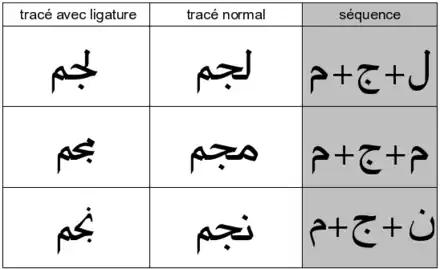 L’alphabet arabe connaît des ligatures esthétiques. Celles-ci sont optionnelles et se rencontrent surtout dans des compositions soignées. Ces ligatures ne doivent pas être confondues avec les variantes contextuelles ou la ligature linguistique lâm ’alif, (voir plus bas) lesquelles sont toutes deux obligatoires. Voici ci-contre quelques ligatures possibles. Rappelons que l’arabe s’écrit de droite à gauche ; dans le tableau, les ligatures concernent, dans l’ordre, les lettres lâm, mîm et nûn formant ligature avec un jîm. Pour des raisons de lisibilité, on a ajouté un mîm final, qui ne fait pas partie de la ligature.