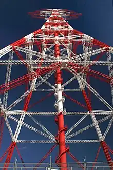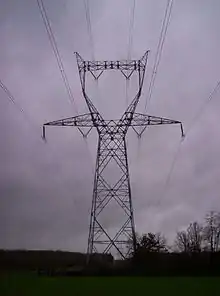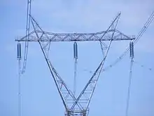 Un pylône d'une ligne à 735 kV d'Hydro-Québec, reconnaissable à ses entretoises en X, qui maintiennent écartés les quatre conducteurs de chaque phase ce qui, en raison de l'effet de peau, provoque moins de pertes qu'un seul conducteur de même section. Le réseau de transport québécois compte 11 422 km de lignes à 735 et 765 kV, qui acheminent l'électricité des centrales hydroélectriques nordiques vers les centres de consommation du sud.