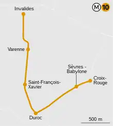 Les travaux du tronçon Invalides - Croix-Rouge commencent en 1913 pour se terminer le . Mais la perspective d'une rentabilité douteuse sur un tronçon aussi court desservant des quartiers peu actifs conduit la Compagnie du chemin de fer métropolitain de Paris (CMP) à en ralentir l'équipement pour reporter au maximum l'ouverture et le déficit qui en résultera. Mise en demeure par la Ville, la compagnie ouvre finalement la ligne à l'exploitation le [1]. La nouvelle ligne 10 comporte six stations, toutes voûtées. Elle emprunte les rues du Four, de Sèvres et le boulevard des Invalides avec un coude très prononcé à Duroc.