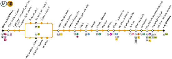 La ligne 10, dont le parcours est entièrement souterrain, est longue de 11,7 kilomètres et comporte vingt-trois stations. Son histoire est liée à celle des lignes 7, 8 et 13. Une partie de la section d'origine est reprise par la ligne 13 ; elle utilise une partie de la ligne 7 pendant plus d'un an et enfin reprend le tronçon occidental de la ligne 8 quand celle-ci change de terminus pour Balard. Elle est l'une des lignes du métro de Paris dont le tracé évolue le plus au cours de son histoire. Les parois des tunnels de cette ligne ont la particularité d'être peintes en blanc, ce qui lui confère une luminosité que l'on ne trouve nulle part ailleurs sur le réseau.