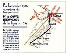 Le tronçon Invalides - Duroc est retiré à la ligne 10 et incorporé à la ligne 14. Un premier tronçon d'une longueur de 2,3 kilomètres relie la porte de Vanves à la place Bienvenüe à partir du , où une correspondance est assurée avec ce qui est alors la ligne 5. Le raccordement Duroc - Bienvenüe est achevé en même temps, mais il faut attendre le remodelage de la ligne 10 et l'achèvement du tronçon La Motte-Picquet - Balard de la ligne 8 pour voir la ligne 14 entièrement ouverte. Dans la nuit du 26 au , un remaniement des voies, prévu afin de ne pas affecter l'exploitation, permet de mettre en place la configuration définitive des lignes 8, 10 et 14 : le 27 au matin, les trains de la ligne 8 sont déviés de Porte d'Auteuil vers Balard, et ceux de la ligne 14 relient dès lors la porte de Vanves à Invalides sur une longueur de 4,6 kilomètres. La ligne 10 est ouverte quant à elle dans son intégralité le surlendemain, , de Jussieu à Porte d'Auteuil.