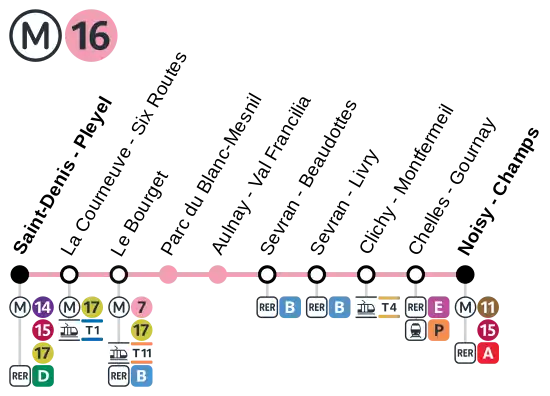 La ligne 16 du métro est entièrement souterraine. Elle constituera une liaison de rocade desservant des banlieues éloignées de la capitale, dans le département de la Seine-Saint-Denis. La desserte de Clichy-sous-Bois et de Montfermeil, notamment, permettra de désenclaver ces communes actuellement éloignées de tout moyen de transport lourd en les reliant aux lignes B et E du RER, ainsi qu'aux pôles de développement économiques de Noisy-le-Grand et de Plaine Commune. D'une longueur de 27,5 km environ dont un tronc commun de 5,5 km avec la ligne 17, entre Saint-Denis Pleyel et Le Bourget RER[33], elle desservira dix stations entre Noisy - Champs et Saint-Denis Pleyel.