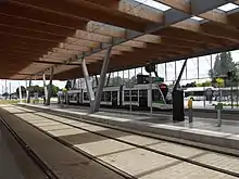 - La station François Mitterrand, qui constitue le terminus le plus à l'ouest de la ligne, est composée de deux quais encadrant deux voies. Dans le prolongement de la station, se situe un tiroir de retournement à voie unique le long du parc relais « François Mitterrand » permettant le retournement des rames. Deux trams sur 3 desservent cette station[13].