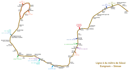 La ligne 6 du métro de Séoul, gérée par la Seoul Metropolitan Rapid Transit Corporation (SMRT), traverse le nord de la ville en formant un U.