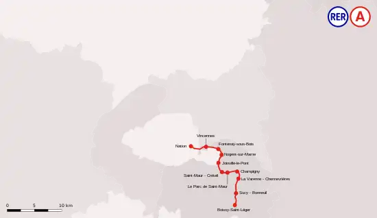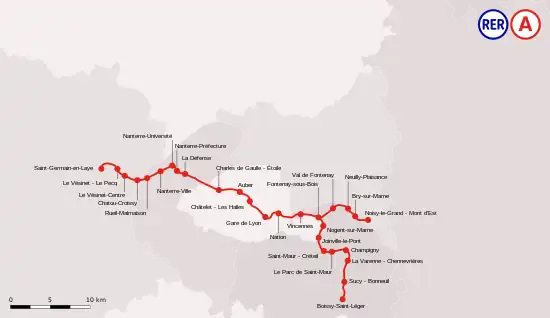 La ligne A du RER d'Île-de-France, plus souvent simplement nommée RER A, est une ligne du réseau express régional d'Île-de-France qui traverse d'est en ouest l'agglomération parisienne, avec plusieurs branches aux extrémités d'un tronçon central. Elle relie Saint-Germain-en-Laye, Cergy et Poissy à l'ouest, à Boissy-Saint-Léger et Marne-la-Vallée à l'est, en passant par le cœur de Paris.