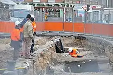 La ligne n'a pas nécessité la création d'ouvrages d'art particulier, le plus notable est le pont de la Chistera qui permet de franchir un bassin de rétention des eaux de Cofiroute[31]. En revanche, la ligne a nécessité de nombreuses fouilles archéologies dans l'hyper-centre d'Orléans entre et , rue du Faubourg Madeleine et entre les places de Gaulle et de l'Étape, menées par l'INRAP, qui permit de mettre au jour les anciens remparts d'avant le XVe siècle, des restes d'habitations, des vestiges gaulois et gallo-romains et approfondir les connaissances sur l'ancien prieuré de la Madeleine[32].