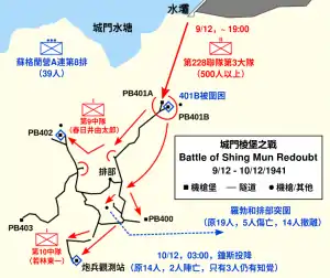 Le 9 décembre, les éclaireurs japonais du 228e régiment se dirigent vers le mont Tai Mo Shan et découvrent que les défenses britanniques sont faibles au 225 High Ground près de la redoute et du réservoir de Shing Mun. Le terrain surélevé domine toutes les positions de la partie ouest de la ligne. Par conséquent, les Japonais entament les préparations d'une attaque surprise.