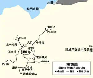 Le quartier général défensif est situé dans la redoute de Shing Mun (城門棱堡 ou 城門碉堡), qui a un poste d'observation (agissant comme quartier général de la redoute) qui peut appeler le soutien d'artillerie de la batterie du mont Davis (en) et du fort de l'île Stonecutters, et quatre casemates (PB400-403) équipées de mitrailleuses Vickers et de Bren LMG. Des canaux et tranchées défensives de 1,5 mètre de profondeur, nommés d'après des rues de Londres telles que Charing Cross, sont creusés pour aider les soldats britanniques du régiment du Middlesex (en).