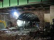 Le tunnel de la gare, quant à lui, mesure 112 m de long pour une ouverture de 5,5 m[A 9]. Il est entrepris par l'entrée sud. Plusieurs dégâts retarderont l'avancement de la percée du tunnel. L'appartement du chef de la gare de Lausanne a notamment du être évacué. Les frais de réparation coûteront à la compagnie entre 50 000 et 60 000 CHF[A 10].