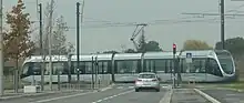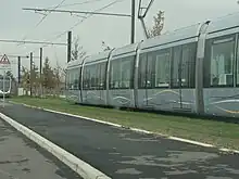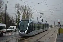 Vingt-huit rames du Citadis 302 d'Alstom, au nez dessiné par Airbus, équipent la ligne. Elles circulent entre 20 km/h et 22 km/h en moyenne, avec des pointes à 50 km/h[35]. Chaque rame mesure 32 m de long, 2,4 m de largeur, 39 tonnes à vide et peut accueillir environ deux cent huit personnes[36], avec plus de 30 % de places assises. Grâce au plancher bas intégral, l'ensemble de la rame est accessible aux personnes à mobilité réduite.