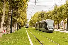 Le tramway, alimenté par une ligne aérienne de contact, circule sur une voie ferrée.