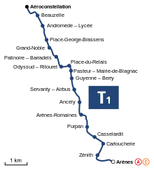 La ligne T1 s'étend sur 14,8 km et compte vingt-cinq stations, depuis Palais-de-Justice en passant par Arènes, jusqu'au MEETT, au nord-ouest de l'agglomération. Elle est connectée aux lignes