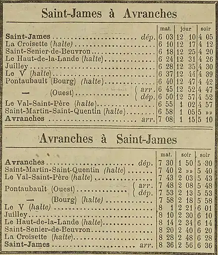 La ligne, de 17 km à voie métrique[1], d'Avranches à Saint-James est incluse dans l'acte de rétrocession de la concession de la ligne Pontorson - Mont-Saint-Michel, signé par le préfet et MM. Baër et Beldant, en 1899[2].