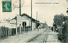 On distingue sur le panneau du premier plan et le pignon de la maison au-delà de la gare la mention « Ventes - Locations ». L'urbanisation de la ville s'est faite sous forme de lotissements de terrains de la forêt de Bondy, accueillant des salariés de Paris grâce à l'amélioration des déplacements rendue possible par la ligne