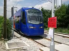 Rame du T4 passant devant le bâtiment voyageurs de l'ancienne gare des Coquetiers. | |