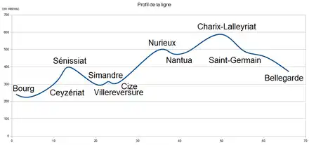 - elle possède une forte dénivellation, son altitude variant d'environ 240 mètres à Bourg-en-Bresse à 587 mètres au niveau de Charix-Lalleyriat[25]. La déclivité maximale est de 35 ‰ au niveau de la trémie remplaçant le PN 5[8] ;