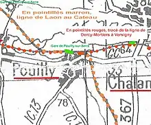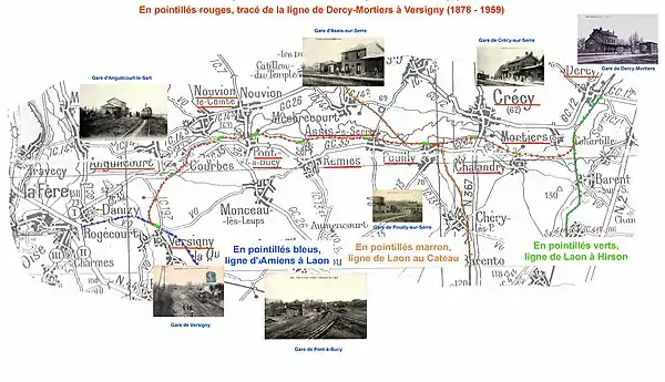 | Versigny | À Versigny, la ligne de Dercy-Mortiers à Versigny rejoignait la ligne de Laon à Amiens. La gare était commune aux deux lignes. | ![]() | ![]() |