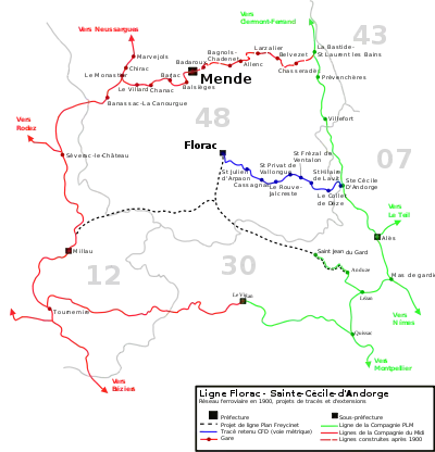 Devant le refus de la Compagnie des Chemins de fer de Paris à Lyon et à la Méditerranée (PLM), qui exploitait déjà les lignes du Gard et la Ligne des Cévennes, de prendre la concession de cette ligne jugée peu rentable, un tracé à voie métrique entre Florac et Sainte-Cécile-d'Andorge fut étudié.