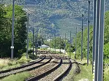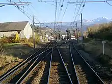 Jonction entre la ligne de Culoz à Modane (à gauche) et la ligne de Grenoble (à droite), en gare de Montmélian.