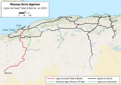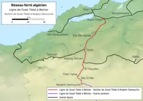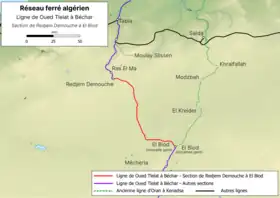 La ligne de Oued Tlelat à Béchar permet de relier Oran à Béchar depuis 2010, où cette nouvelle ligne a été mise en service à partir de sections de deux anciennes lignes datant de la fin du XIXe siècle : Oued Tlelat – Redjem Demouche et El Biod – Béchar et par la création d'une nouvelle section entre Redjem Demouche et El Biod.