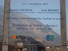 La ligne transpyrénéenne de Pau à Canfranc fait partie de l'axe entre Bordeaux et Saragosse et porte depuis 2003 le nom de Ligne Goya, en hommage au peintre Francisco de Goya né à proximité de Saragosse et mort à Bordeaux.