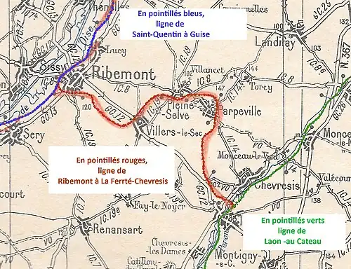A Ribemont, la ligne rejoignait la ligne de Saint-Quentin à Guise, à La Ferté-Chevresis, elle se raccordait à la ligne de Laon au Cateau.