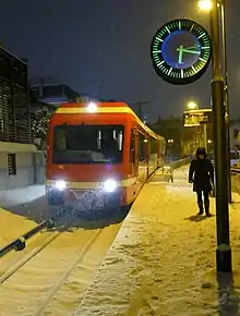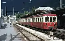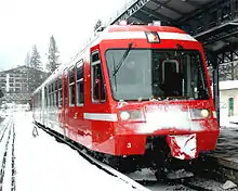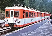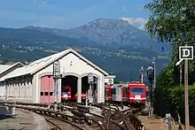 La ligne part de la gare de Saint-Gervais-les-Bains-Le Fayet, où elle est en correspondance avec le réseau SNCF à voie normale (terminus de la ligne en provenance d'Aix-les-Bains, via Annecy et la Roche-sur-Foron), ainsi qu'avec le tramway du Mont-Blanc (TMB), qui est un chemin de fer à crémaillère[47]. Cette gare reçoit des TGV en provenance de Paris en pleine saison d'hiver et d'été. Elle dispose d'un faisceau à voie métrique assez important[48], avec notamment une remise-ateliers à trois voies, une plaque tournante et une machine à laver.