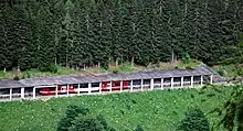 Afin de permettre l'exploitation de la ligne à longueur d'année, cinq galeries paravalanches ont été construites dans les années 1920. Elles totalisent 861 m de longueur. Elles sont complétées par d'autres ouvrages de protection : murs paravalanches, filets de protection, fils de protection des chutes de rochers[63]. Notamment, un gigantesque mur déflecteur d'avalanche en forme de chevron est installé dans le couloir des Chéserys[64]. Une digue de grande taille a été construite dans les années 1980 pour protéger la tête du tunnel des Montets côté Vallorcine.