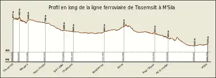 La ligne a pour origine la gare de Tissemsilt (PK 0 de la ligne), gare établie à 877 m d'altitude, aux pieds du versant sud la partie centrale l'Atlas tellien, à l'entrée dans les Hauts Plateaux[Note 1],[Note 2]. À la sortie nord-est de la gare, elle prend une direction est, direction qu'elle gardera globalement jusqu'à M'Sila.