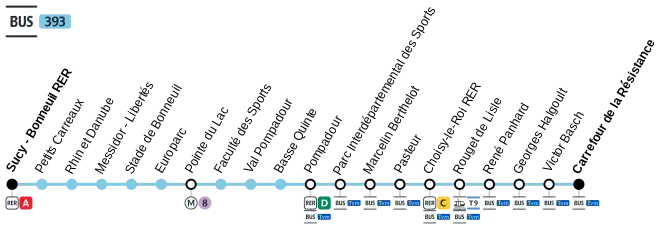 - en direction de Sucy : les bus ne desservaient pas la station Basse Quinte, celle-ci était reportée à l'arrêt Carrefour Pompadour de l'ancien 393. Ainsi, entre Pompadour et le carrefour site propre du 393 / bretelle d'accès à la RN406, les nouveaux 393 prenaient aussi l'itinéraire des anciens 393.