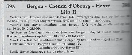 - le entre la gare d'Havré et la place de Maurage (nouvelle section, capital 27), ce nouveau service est exploité sous l'indice L, le H devient un service partiel[3],[2] ;