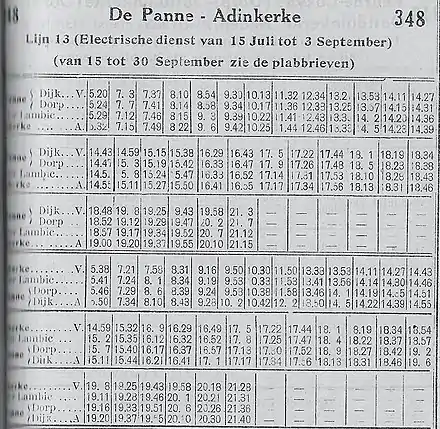 Tableaux[note 4] : 348 (1933)[10], n° de tableau partagé par les lignes 7 Furnes - Coxyde, 9 Furnes - Ostdunkerque, 21 Adinkerque - La Panne et 348 Ostende - Furnes.