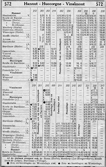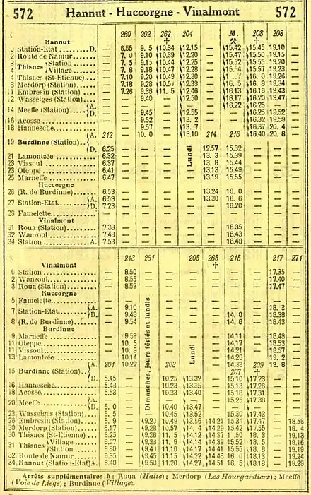 - Été : 572, numéro partagé entre les lignes 572A Burdinne - Hannut et 572B Burdinne - Vinalmont[5].