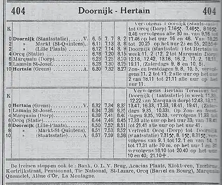- 404B en , numéro et tableau partagés avec la ligne H (404A) Tournai Station-État - Hertain Frontière [5].