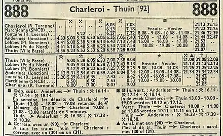 Les points remarquables de son évolution sont : le , prolongement de Lobbes Pont du Nord à Thuin Ville Basse et attribution de l'indice 10 ; en , attribution de l'indice 92 ; en , prolongement vers Charleroi Eden sous l'indice 92, service partiel Anderlues - Thuin sous l'indice 91 ; le , déviation par le métro léger sur la section Morgnies - Paradis ; le , suppression du service 92, maintien du service 91 entre Anderlues Jonction et Thuin Ville Basse.