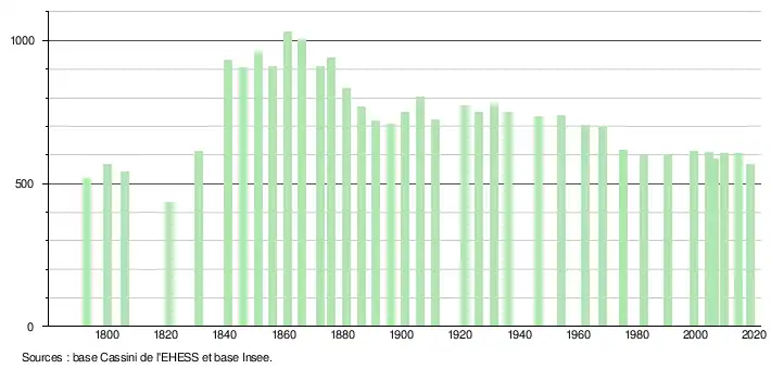 L'évolution du nombre d'habitants est connue à travers les recensements de la population effectués dans la commune depuis 1793. Pour les communes de moins de 10 000 habitants, une enquête de recensement portant sur toute la population est réalisée tous les cinq ans, les populations légales des années intermédiaires étant quant à elles estimées par interpolation ou extrapolation[25]. Pour la commune, le premier recensement exhaustif entrant dans le cadre du nouveau dispositif a été réalisé en 2004[26].