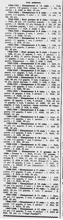 - * Pas de Ligue d'Alger de 1939 à 1946 pour cause de la Seconde Guerre mondiale. Un Critérium de Guerre est organisé à la place qui apparemment est compté avec la Ligue d'Alger[réf. nécessaire].