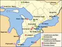 - 1994 : la ligue se subdivise en trois divisions : Guelph, Sudbury, Owen Sound, Niagara Falls, et Kitchener dans la division Centrale ; Kingston, Oshawa, North Bay, Belleville, Peterborough et Ottawa joue dans la division de l'Est ; Détroit, Windsor, Sarnia, London et Sault-Sainte-Marie dans la division de le l'Ouest. Les Royals de Newmarket déménagent à Sarnia.
