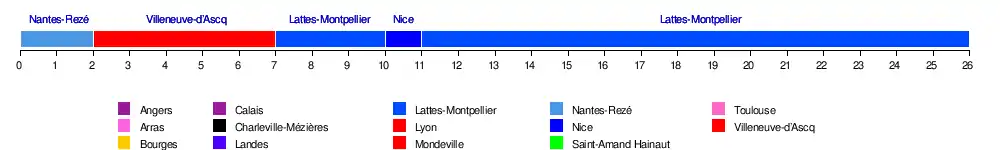 | Toulouse | 8 | 9 | 11 | 11 | 12 | 13 | 13 | 13 | 14 | 14 | 14-1 | 13-1 | 13-1 | 12-1 | 12-1 | 14-1 | 12-1 | 12 | 11 | 11 | 11 | 11 | 12 | 12 | 12 | 12 | 18 | |