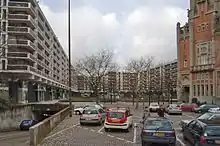 - La tour de la Cité administrative édifiée de 1951 à 1955 agrandie d'une deuxième aile de 1964 à 1965 à la lisière de l'ancien quartier, à côté de l'emplacement de l'ancienne porte de Tournai détruite en 1924[40],