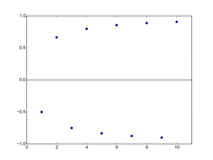 La suite (–12, 23, –34, 45, –56, …) = (cf. figure) est décomposable en deux sous-suites :