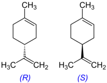 Le limonène est une molécule chirale, et, comme pour de nombreuses molécules chirales, les sources biologiques produisent un énantiomère spécifique. La principale source industrielle, l'orange, contient du d-limonène ((+)-limonène), qui est l'énantiomère R dextrogyre[9]. L'eucalyptus et la menthe poivrée, quant à eux, contiennent du l-limonène ((–)-limonène), qui est l'énantiomère S lévogyre[10],[11]. Le limonène racémique est connu en tant que « dipentène »[12].